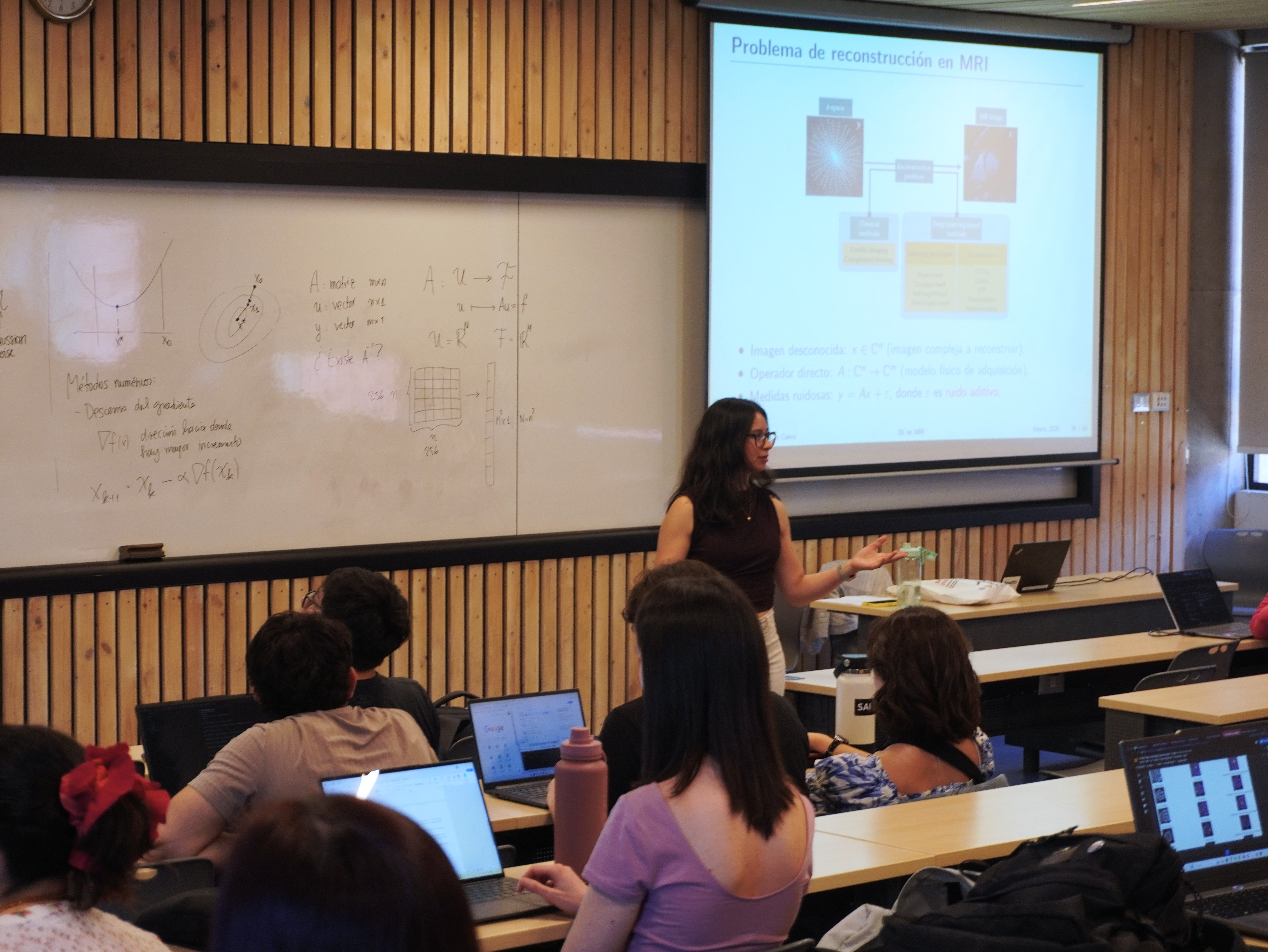 La escuela, de carácter gratuito y dirigida principalmente a estudiantes de pre y postgrado, congregó a participantes de diversas áreas (ingeniería, computación, ciencias de la salud y disciplinas afines) en un programa intensivo que combinó fundamentos teóricos, aplicaciones clínicas y talleres prácticos, desde el análisis de imágenes médicas y señales fisiológicas, hasta el uso de modelos de lenguaje natural y redes neuronales informadas por física (PINNs).