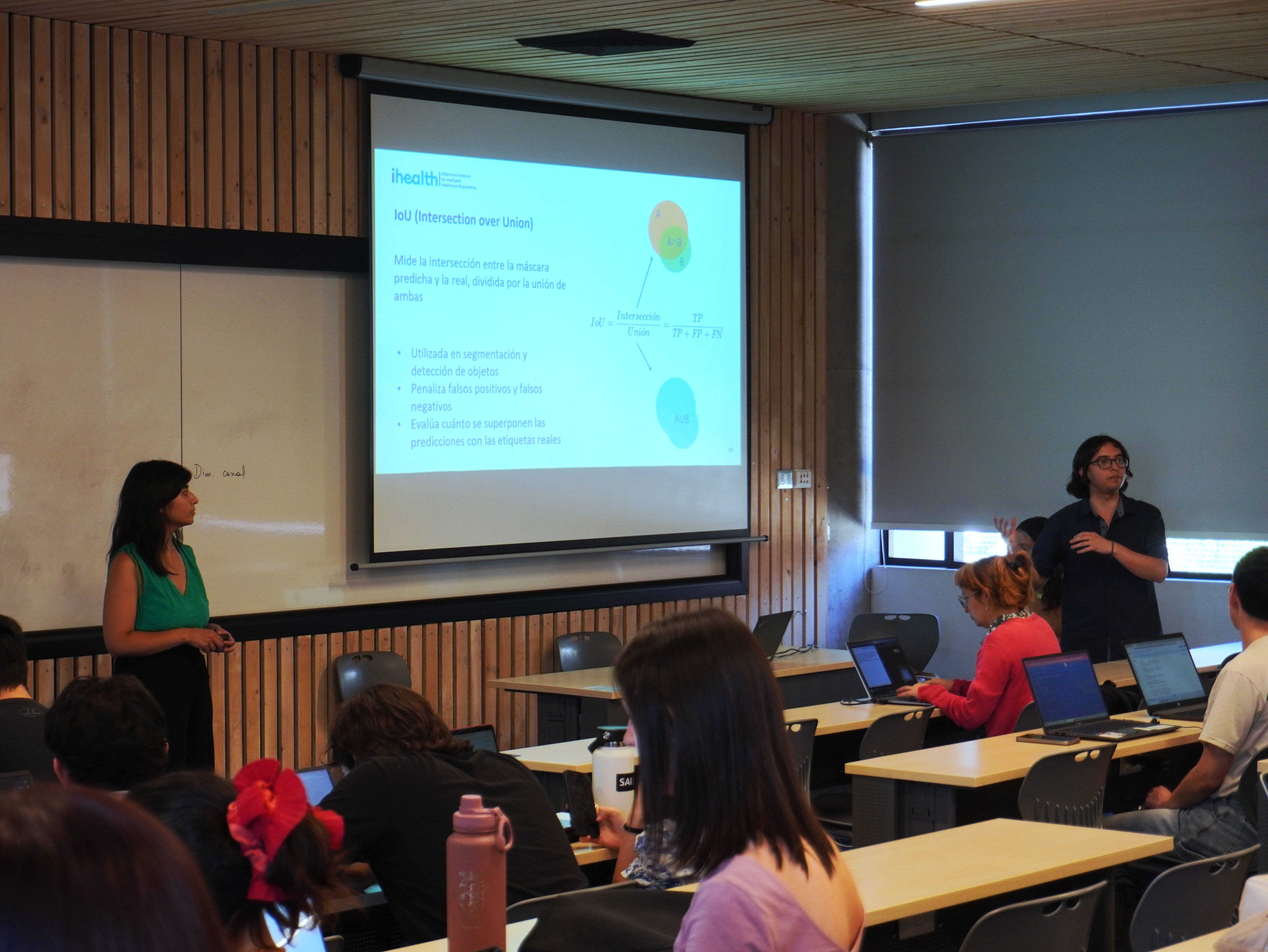 También formaron parte de la escuela, liderando los talleres, jóvenes investigadores, ingenieros y estudiantes de postgrado de iHEALTH. Guillermo Sahonero y Rafael Kaempfer lideraron la introducción a la IA; Marie González, Carmen Meza y Bastián Castelli guiaron el taller de aplicaciones en salud; mientras que Tomás Banduc y Tabita Catalán estuvieron a cargo de la sesión de PINNs.