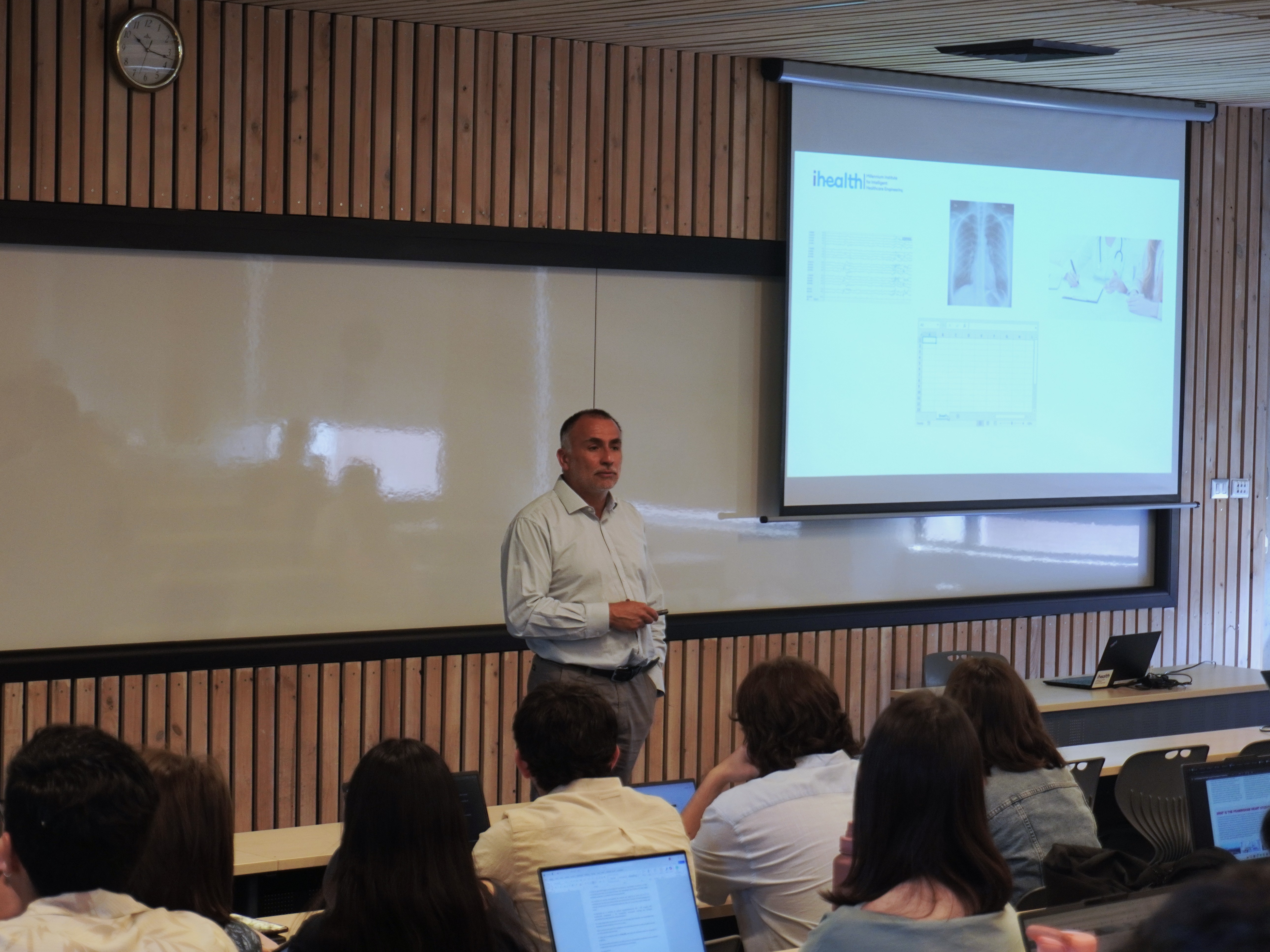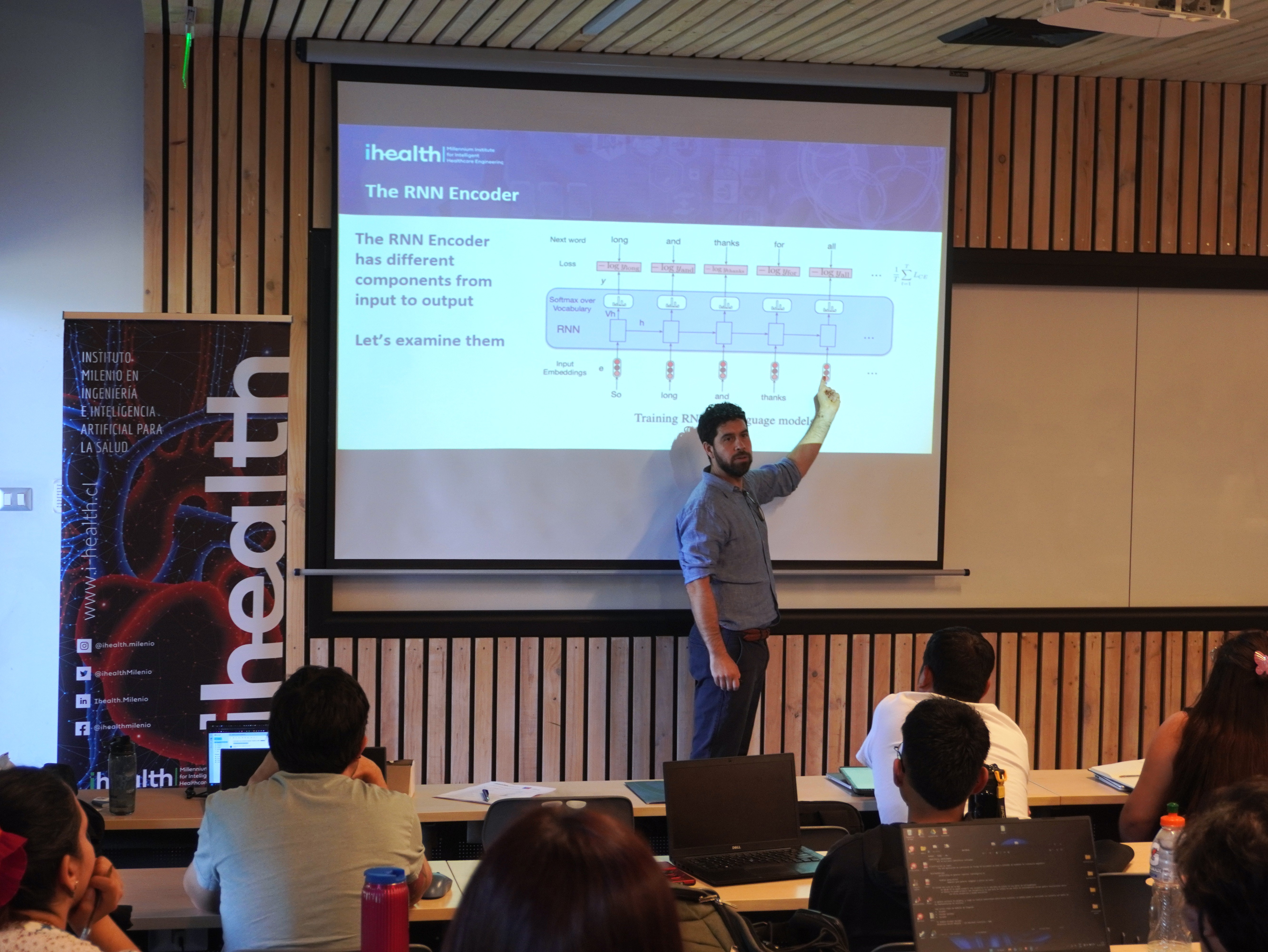 Las clases estuvieron a cargo de los integrantes de iHEALTH: el Dr. Marcelo Andia, profesor de Medicina UC y director del instituto; el Dr. Denis Parra, profesor del Depto de Ciencia de la Computación UC e investigador principal del instituto; las investigadoras postdoctorales de iHEALTH Dra. Evelyn Cueva y Dra. Yoleidy Huérfano; la estudiante de doctorado UC, Tabita Catalán: y el investigador joven del Centro de Investigación Tecnológica en Sistemas Ciberfísicos (CPS-RTC), Dr. Carlos Valle.