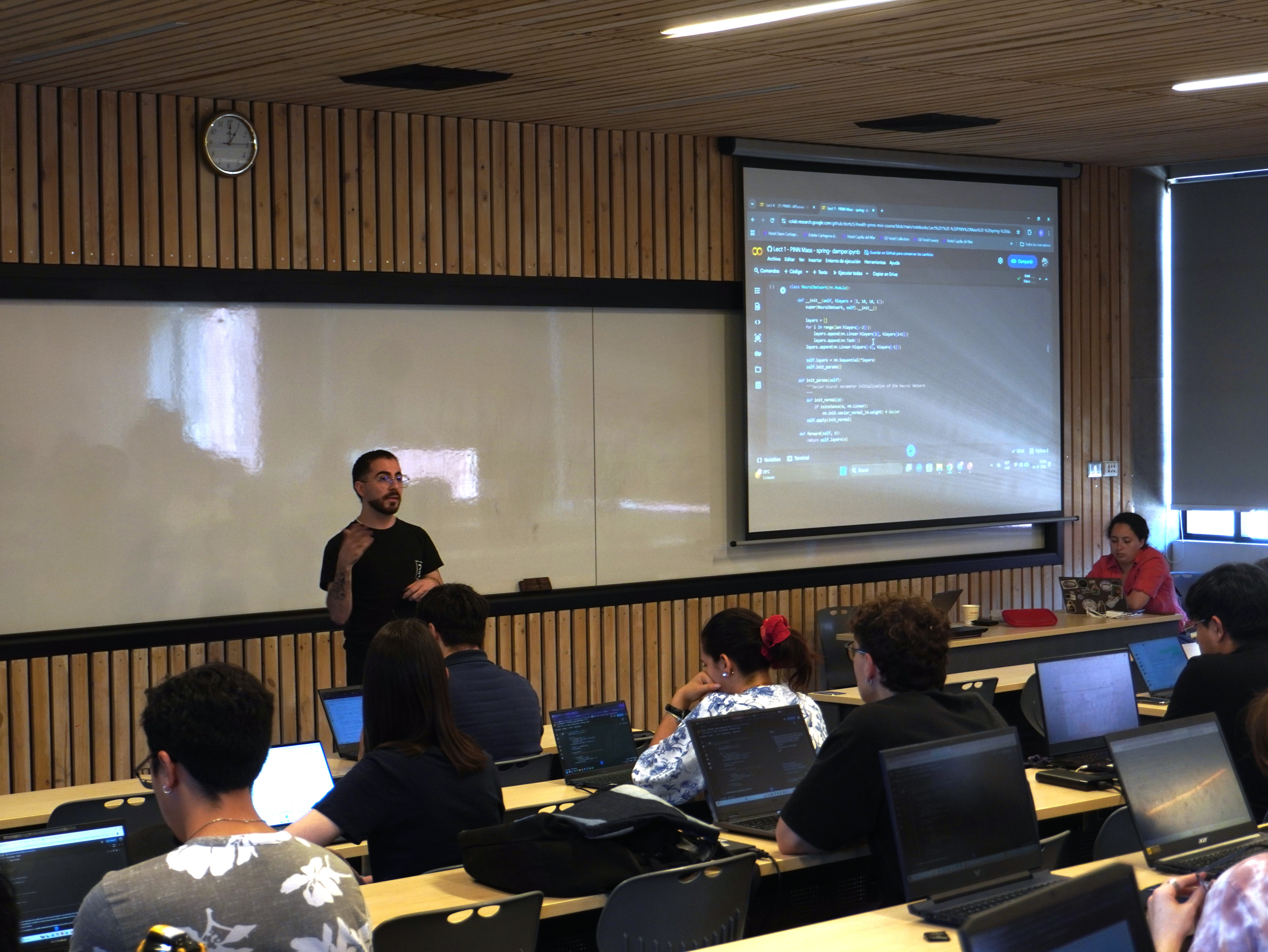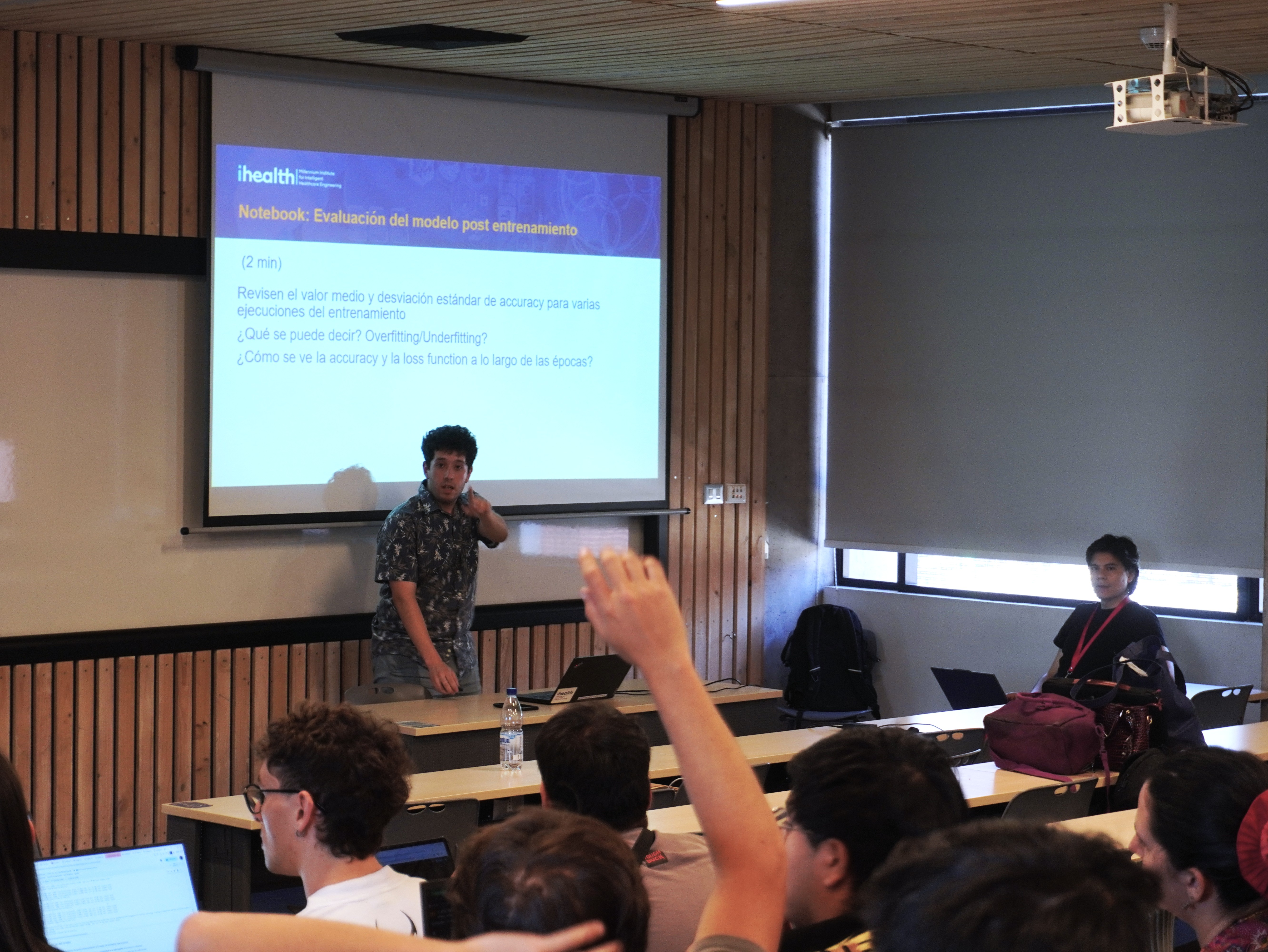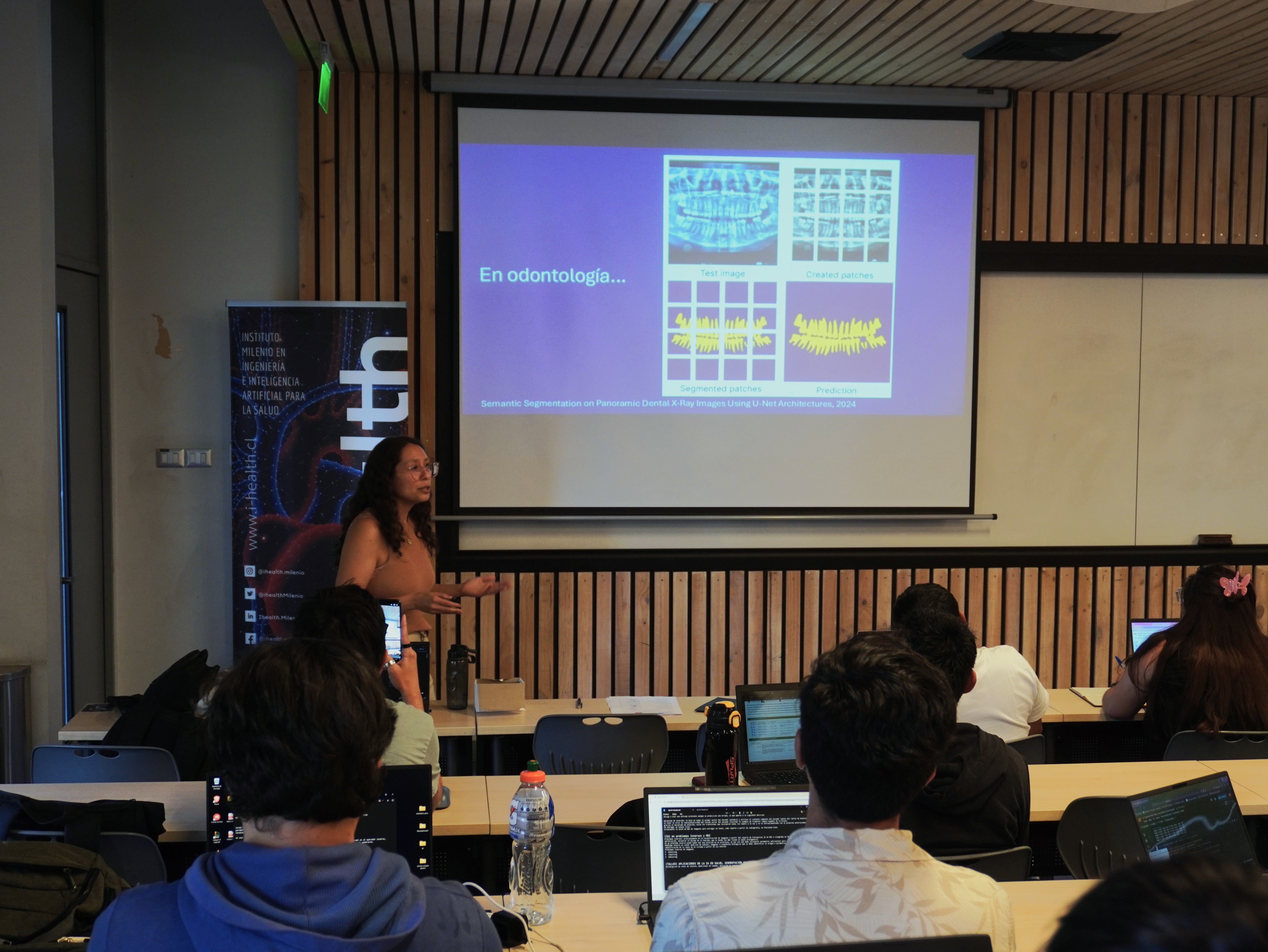 También formaron parte de la escuela, liderando los talleres, jóvenes investigadores, ingenieros y estudiantes de postgrado de iHEALTH. Guillermo Sahonero y Rafael Kaempfer lideraron la introducción a la IA; Marie González, Carmen Meza y Bastián Castelli guiaron el taller de aplicaciones en salud; mientras que Tomás Banduc y Tabita Catalán estuvieron a cargo de la sesión de PINNs.
