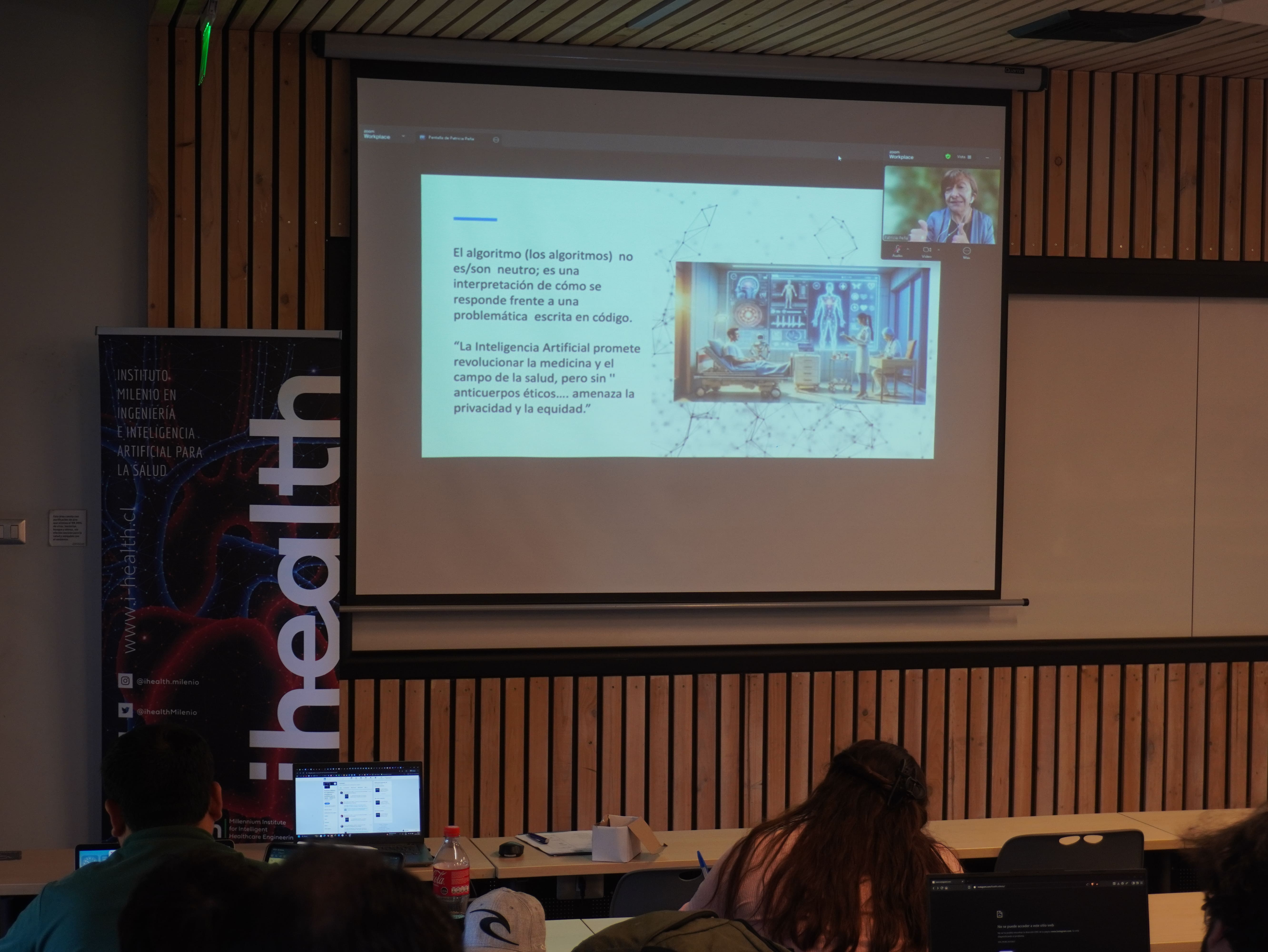 Uno de los momentos destacados fue la charla que abrió la jornada del viernes a cargo de la Dra. Patricia Peña, profesora de la Facultad de Comunicación e Imagen de la Universidad de Chile y directora de la Fundación Datos Protegidos. En su presentación, abordó los sesgos algorítmicos, la protección de datos y los desafíos éticos en el desarrollo e implementación de IA en salud, entregando una perspectiva crítica y necesaria para futuros profesionales que trabajarán con tecnologías sensibles.