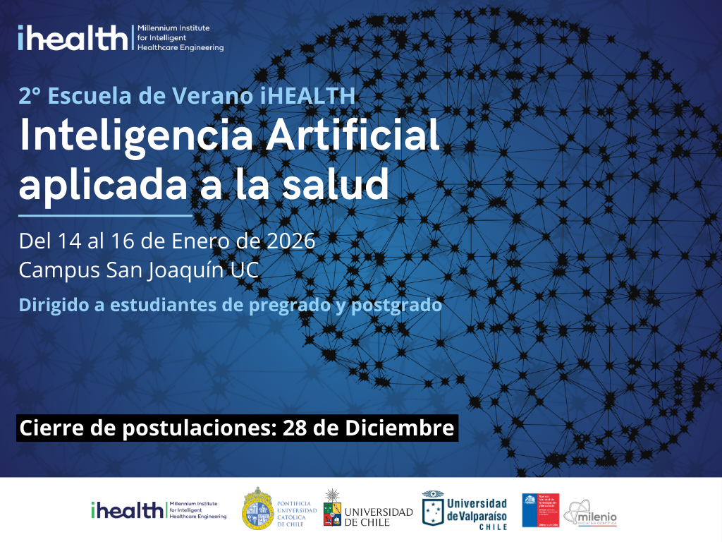 Ya se encuentra oficialmente abierta la convocatoria para participar en la 2° Escuela de Verano iHEALTH en Inteligencia Artificial aplicada a la Salud, organizada por el Instituto Milenio en Ingeniería e Inteligencia Artificial para la Salud (iHEALTH). El evento se llevará a cabo del 14 al 16 de enero de 2026 en el Campus San Joaquín de la Pontificia Universidad Católica de Chile y será totalmente gratuito, por lo que sólo necesitas postular.