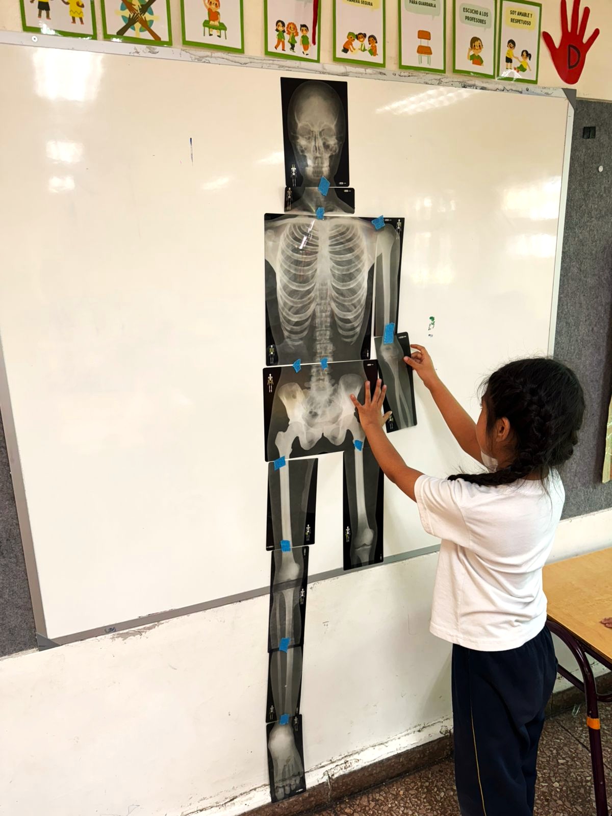 El proyecto giró en torno al relato “Flo y Protonina: el misterio del tobillo roto”, una historia narrada mediante ilustraciones, que despertó la curiosidad de los niños sobre qué hay dentro del cuerpo y cómo podemos utilizar la tecnología para observarlo. La experiencia se complementó con la observación de radiografías de tamaño real y la creación de dibujos de sus propios huesos, generando un primer acercamiento lúdico a las ciencias médicas.